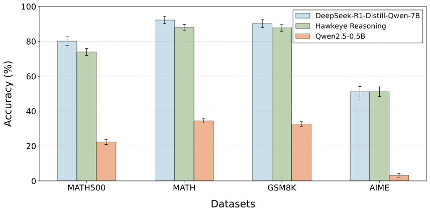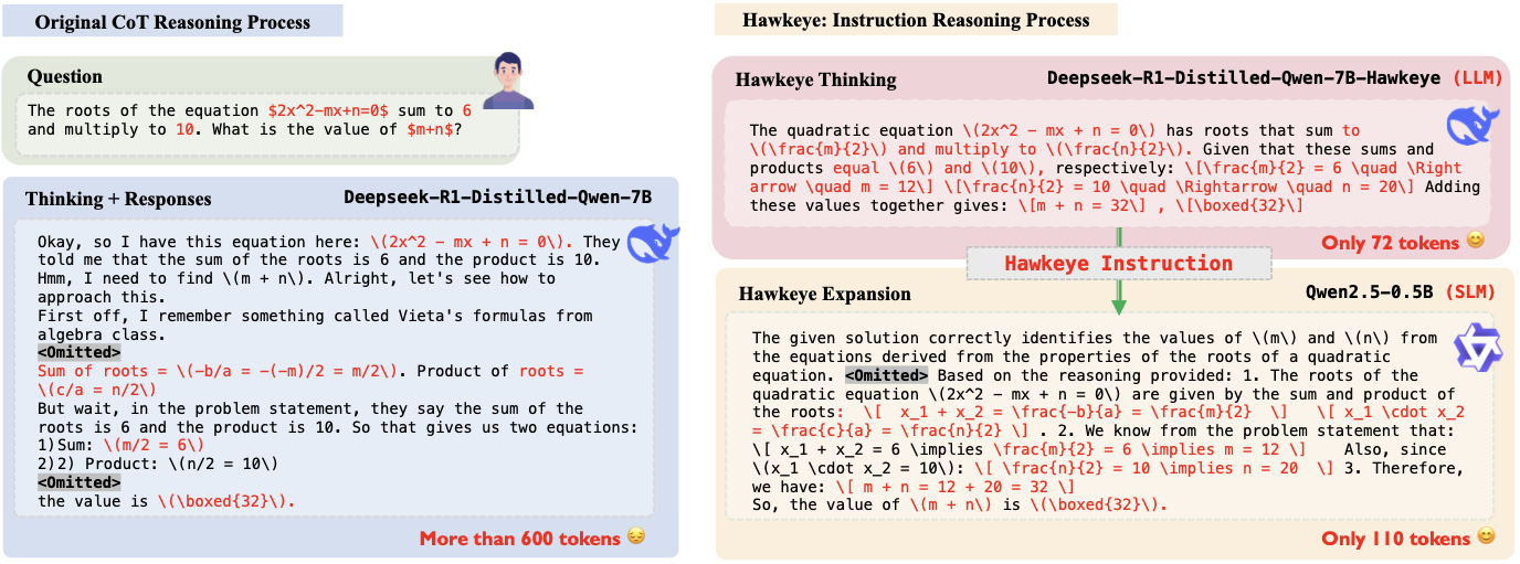 Hawkeye introduces model collaboration, wherein a powerful model generates concise reasoning instructions, and small models expand them into human-readable responses. The core idea behind Hawkeye's post-training is to minimize redundancy in intermediate reasoning tokens and accelerate reasoning, thereby reducing cost while enhancing CoT quality.