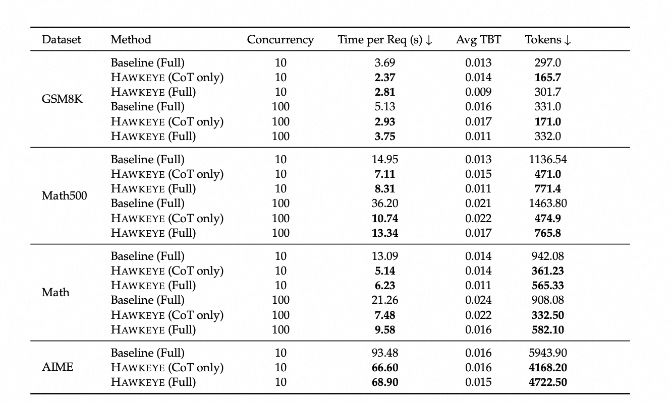 Under a concurrency level of 10, Hawkeye demonstrates inference speedups of up to 1.6×, 2.1×, and 2.5× relative to the baseline on GSM8K, MATH500, and MATH, respectively, while utilizing only 55.7%, 41.1%, and 38.3% of the original total token counts. When the concurrency is increased to 100, the speedup factors further improve to 1.8×, 3.4×, and 2.8×.