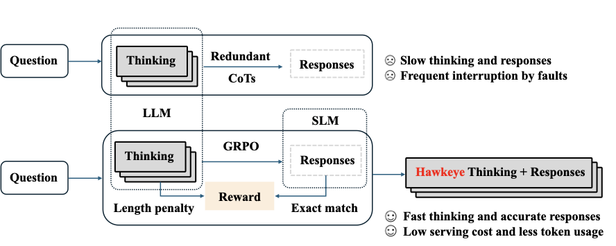 During inference, Hawkeye introduces a novel paradigm in which a large language model (LLM) guides smaller language models (SLMs) to generate answers based on distilled CoTs. Hawkeye achieves nearly a 50% reduction in cost and significantly faster inference without sacrificing response quality.